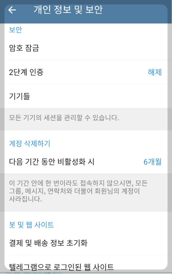 텔레그램 계정삭제를 신청하지 않아도 6개월 이상 온라인으로 접속하지 않으면 텔레그램에 저장된 모든 대화, 연락처, 모든 자료와 함께 계정이 삭제됩니다. 설정에서 비활성 계정이 자동 삭제되는 기간을 변경할 수 있습니다.