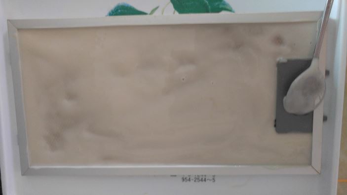 반죽이 묵으면 후드 필터에 발랐을 때 아래로 흘러내릴 수 있으니 약간 뻑뻑한 게 좋습니다.