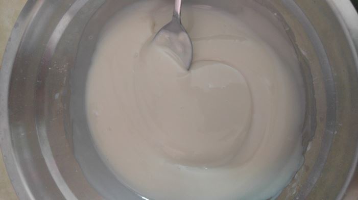 따뜻한 물에 밀가루를 넣은 후 밀가루가 완전히 풀리도록 저어주세요.