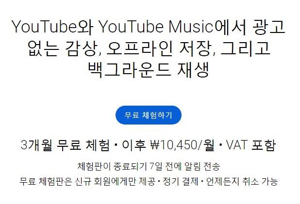 유튜브 프리미엄 가격은 월 10450 (VAT 포함)입니다.