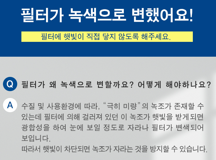 수질 및 사용환경에 따라 "극히 미량"의 녹조가 수돗물에 존재할 수 있는데 필터에 의해 걸러져 있던 이 녹조가 햇빛을 받게 되면 광합성을 하여 눈에 보일 정도로 자라나 필터 일부가 녹색으로 변색되어 보입니다.