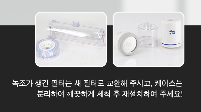 녹조가 생긴 필터는 새 필터로 교환해 주시고, 케이스는 분리하여 깨끗하게 세척 후 잘 말려서 재설치하여 주세요