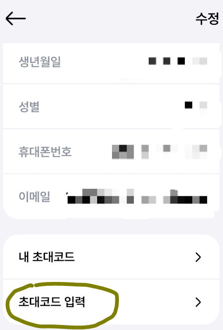 예전에는 개인정보 휴대폰 번호 바로 옆의 인증을 누른 후 초대코드 입력란이 있었는데 입력방법이 변경되었습니다.