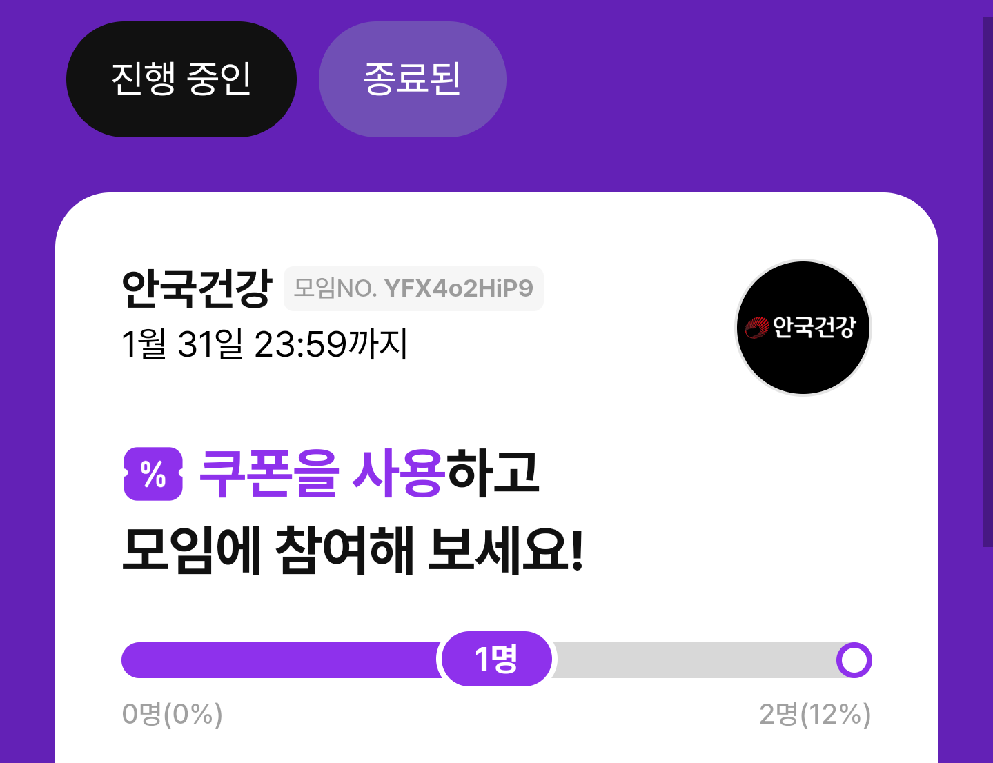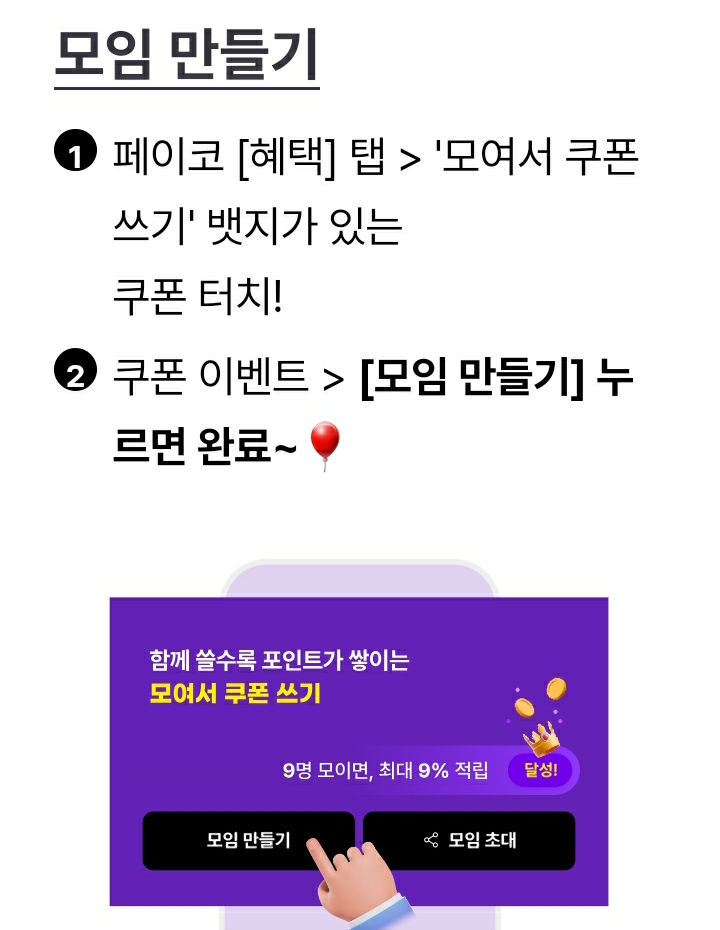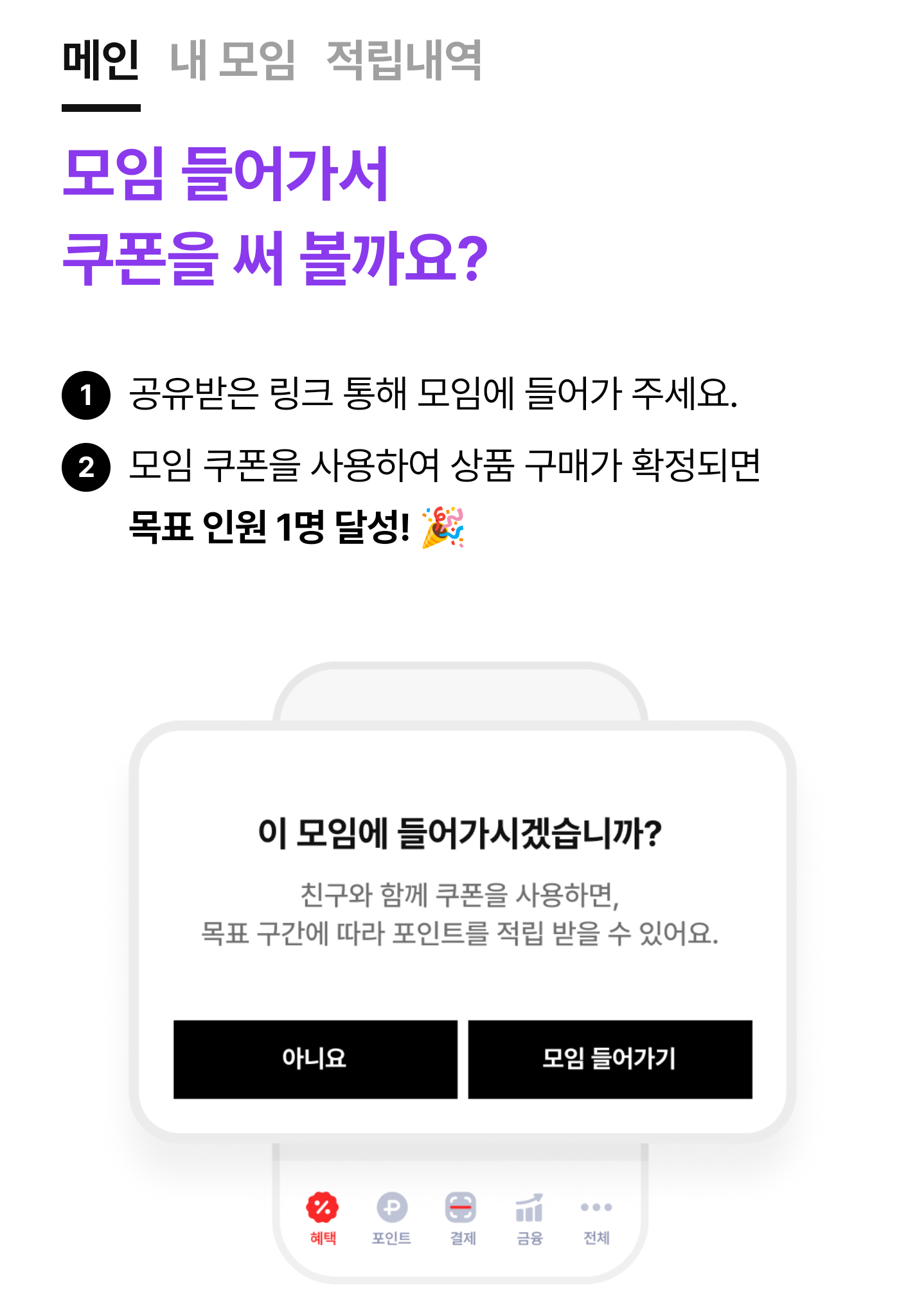 모임을 만든 후나 다른 사람이 만든 모임에 가입한 후 할인쿠폰 적용 결제 완료해야 모임 인원에 포함된다는 점 기억해 주세요.