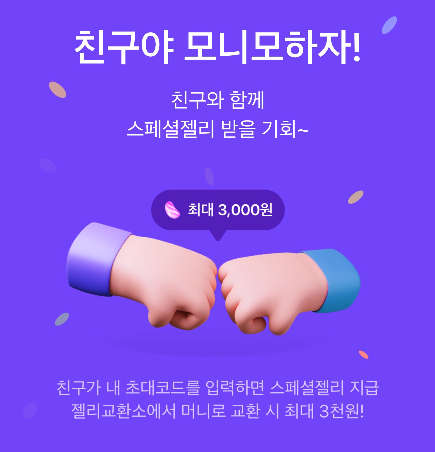 24년 1월 31일까지 모니모 첫 가입하시면 초대코드 입력 시 스페셜젤리 2개를 받을 수 있습니다.