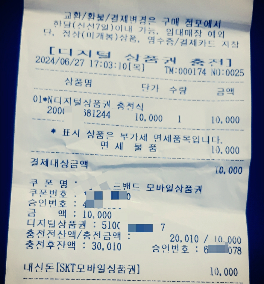 디지털 상품권은 현금과 교환되지 않으며 유효기간은 충전일로부터 5년입니다.